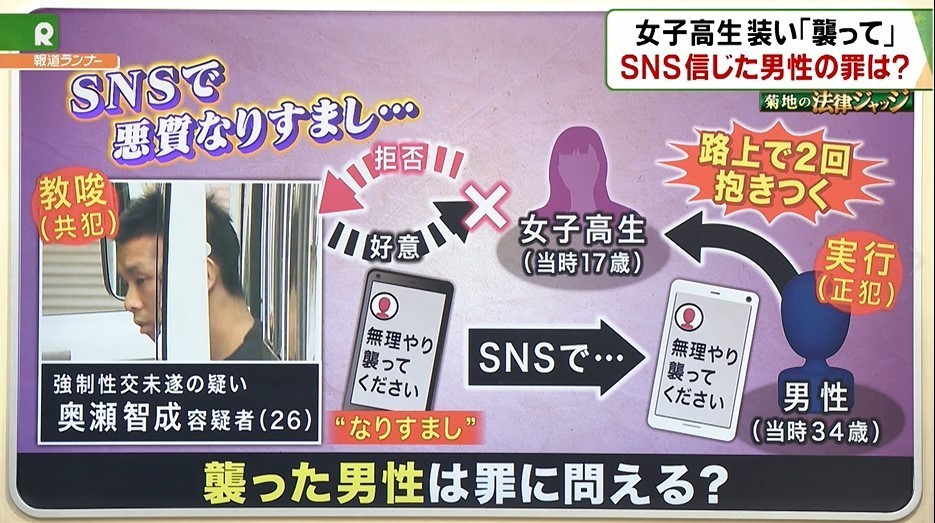 Q.今回のなりすましは、女子高生のSNSを乗っ取ったわけでなく、別のアカウントを同じ名前で作って、その女子高生を騙って「無理やり襲ってください」というメッセージを送ったそうです。そもそもは好意を持っていたのに拒否された腹いせだということです。そうとは知らなかった34歳の男性は、女子高生がその気だと信じ込んで、恐らくは実行に移しました。今のところ、逮捕されているのは奥瀬容疑者のみです。