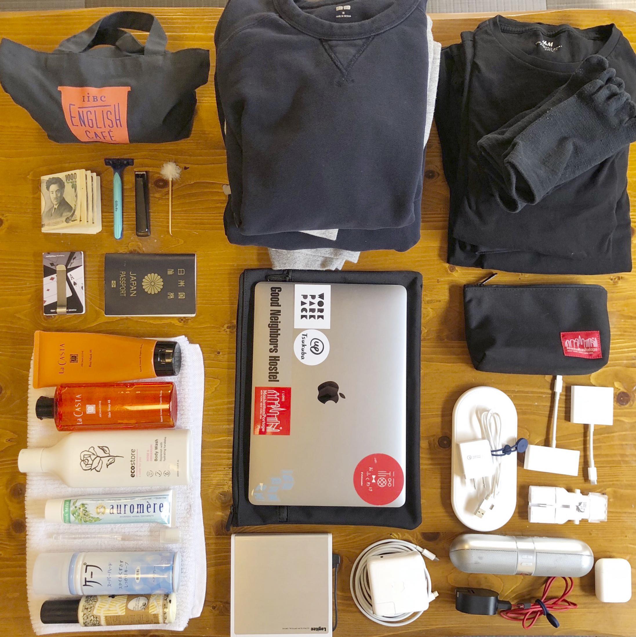 吉川さんが持ち歩くのは、パソコンやパスポート、歯ブラシなどが入った革のリュックサックだけ。下着は4日分。洋服は上下そろったグレーのセットアップ二つで、仕事着と私服を分けない。