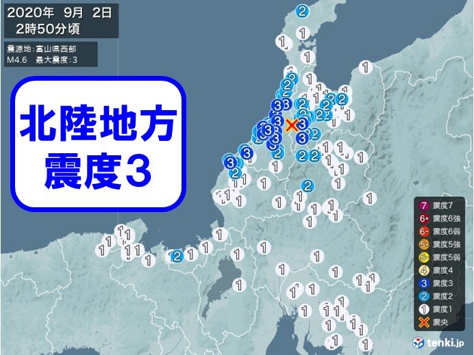 2日午前2時50分頃、富山県西部を震源とするマグニチュード4.6の地震が発生し、富山県、石川県、福井県で最大震度3を観測しました。この地震による津波の心配はありません。