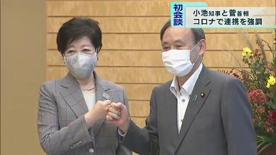東京都の小池知事は9月23日午後、就任後の菅首相と初めて面会し、新型コロナウイルス対策で連携を確認しました。 首相官邸を訪れた小池知事は、新内閣発足後初めて菅首相と直接会談しました。2人はこれまで、政府が進めるGoToキャンペーンに関して批判し合う場面もありましたが、この日は共通の課題である新型コロナ対策とオリンピック開催に向けて、国と都が連携していく姿勢を互いに示しました。会合の後、小池知事は記者団に対し「意見が一致した」などと話し、菅首相との協力関係を強調しました。