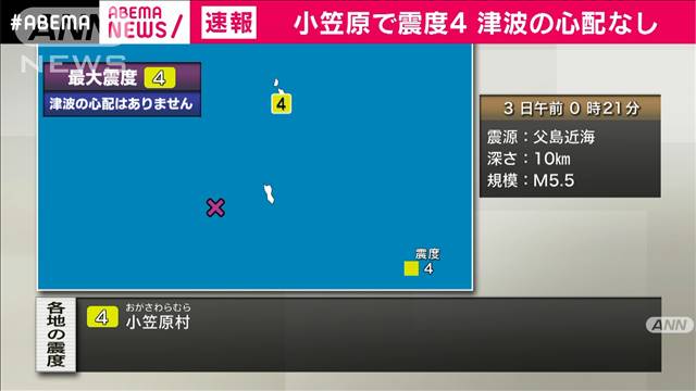 午前0時21分ごろに小笠原村母島で震度4の地震がありました。