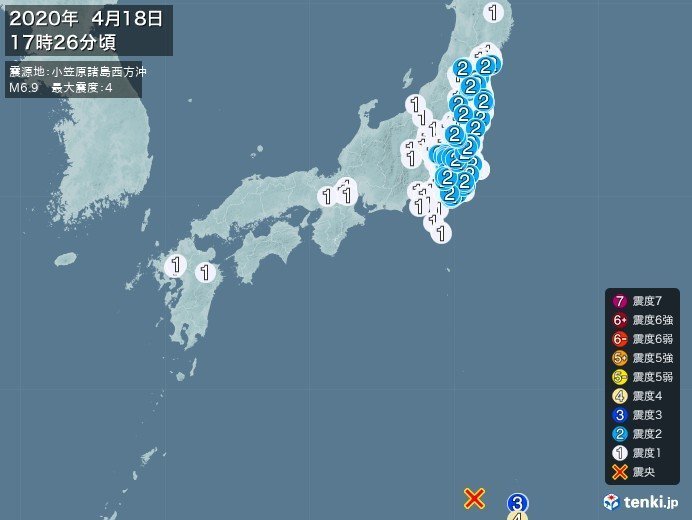 18日17時26分ころ、小笠原諸島で最大震度4を観測する地震がありました。気象庁によりますと震源地は、小笠原諸島西方沖(北緯27.2度、東経140.7度)で、震源の深さは約490km、地震の規模(マグニチュード)は6.9と推定されています。この地震による津波の心配はありません。