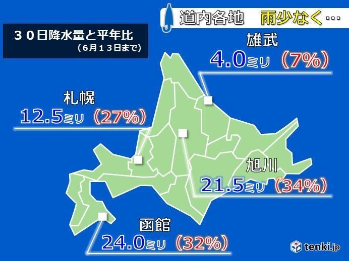 昨日(13日)までの30日間の降水量は、道内の約9割の地点で平年より少なくなっています。