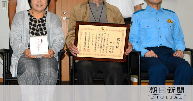 香川県東かがわ市の山中で脱水症状を起こし、歩けなくなっていた高齢の男性を救助したとして、高松南署は2日、徳島県阿波市の会社員林正幸さん(68)と妻の治代さん(64)に感謝状を贈った。