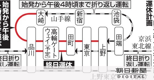 山手線は始発から午後4時ごろまで、上野―大崎で運休。外回りは上野で、内回りは大崎で折り返し運転し、運転本数も通常の7割ほどに減る。京浜東北線は品川―田町で終日運休。大船方面から来る北行は品川で、大宮方面からの南行は田町か東十条で折り返し運転し、すべて各駅停車で運行する。