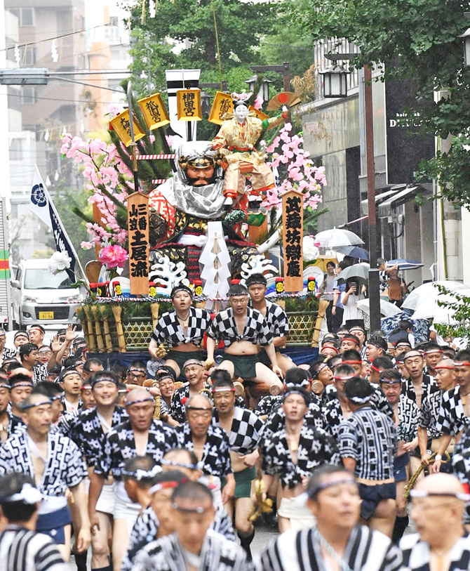 三番山笠・土居流(江里口直文総務)は午後5時前、福岡市博多区奈良屋町の山小屋を出発した。水法被姿の男たちが武蔵坊弁慶の人形を載せた重さ約1トンの舁き山笠を担いで博多の街を疾走。男たちは沿道からの勢水(きおいみず)と雨でびしょぬれになりながら1年ぶりの舁き棒の感触を確かめた。