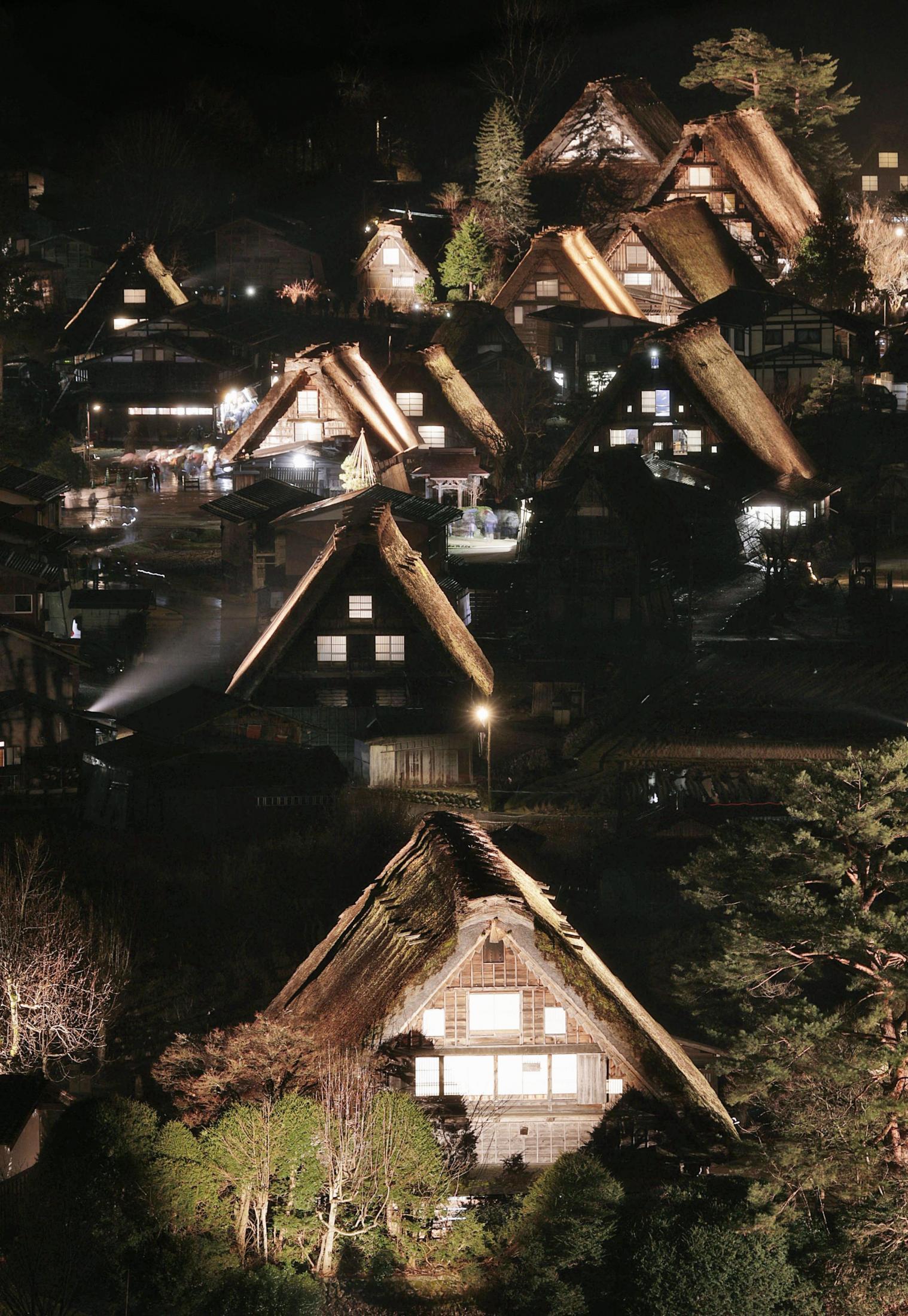 世界遺産に登録されている岐阜県白川村の白川郷で13日、合掌造り集落のライトアップが始まった。暖冬の影響で積雪はなかったが、オレンジ色の光が夕闇の集落を照らし、観光客は幻想的に浮かび上がるかやぶき屋根に見入った。
