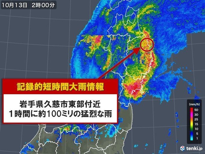 岩手県久慈市東部付近では、13日午前2時までの1時間に約100ミリの猛烈な雨が降ったとみられ、「記録的短時間大雨情報」が発表されました。岩手県では13日に入ってから4回目の「記録的短時間大雨情報」の発表です。