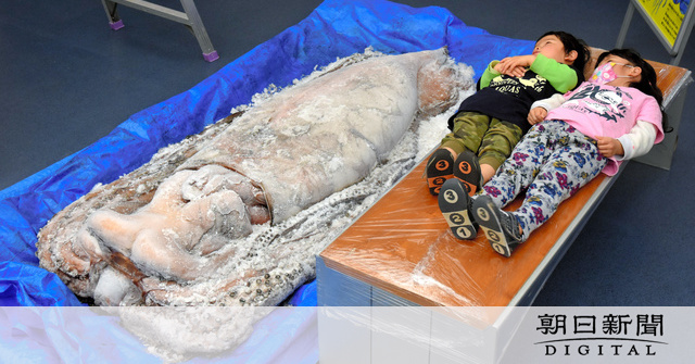 【島根】出雲市沖で先月、生きたまま発見された巨大深海生物ダイオウイカの冷凍標本が10日、しまね海洋館アクアス(江津・浜田両市)でアクアスのファンクラブ会員向けに公開された。参加者はめったに見ることができない珍しい生き物の大きさに驚いていた。