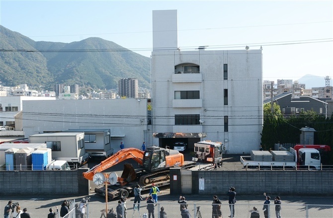 15日午後1時40分すぎ。高さ約2メートルのコンクリート塀に囲まれた事務所の門扉が開くと、大型のパワーショベルなどを積んだトラックが次々と入っていった。