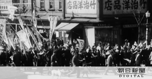 映像には、軍用犬を盛大に送り出す出征の様子が描かれていた。撮影された80年前、イヌと飼い主たちは小樽の目抜き通りを行進。