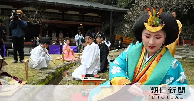 宮中行事を再現する「曲水の宴」が3日、福岡県太宰府市の太宰府天満宮であった。上流から流された杯が届く間に、和歌を詠むという優雅な会。十二単(ひとえ)などの平安装束を着た13人が、ゆらゆら流れる杯を見つつ、短冊に和歌をしたためた。