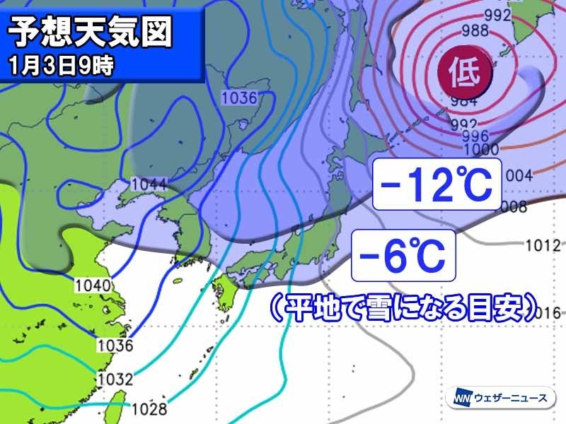 寒気のピークが予想されるのが1月3日頃。平地で雪の目安になる上空1500m付近-6℃以下の寒気が日本列島の大部分を覆う予想となっています。