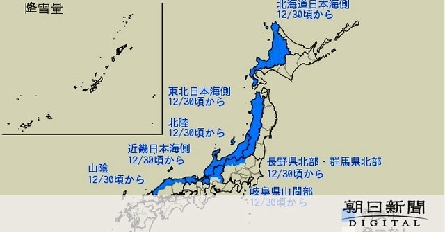 同庁は24日に報道陣を集めて見通しを説明した。1週間ほど先の気象状況について説明の場を設けるのは異例で、担当者は「帰省などで人の移動が多い時期に大雪が予想されている。心構えを高めて頂きたい」と話し、積雪などによる交通障害や農業施設などへの被害、なだれなどへの注意を呼びかけた。(山岸玲)