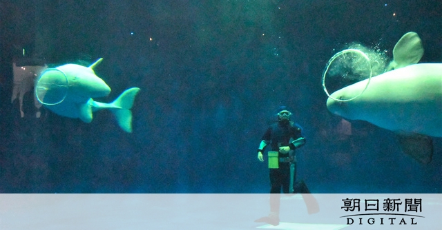 島根県浜田市の水族館「県立しまね海洋館アクアス」で7日、シロイルカのパフォーマンスが約1カ月ぶりに再開した。シロイルカのオス「ケーリャ」が死んでから休止していた。水中で泡の輪をつくる「バブルリング」で人気を博したケーリャに代わって主役になったのは2頭の子どもたち。華麗な演技でさっそく観客を魅了した。