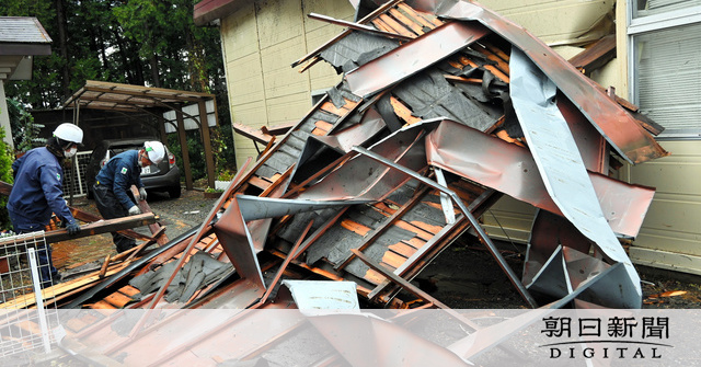 同市西郷では、駐車場兼物置小屋の屋根が飛ばされ、周囲の民家などにぶつかった。小屋の所有者によると、飛ばされた屋根は幅約10メートル、奥行き約5メートルだという。近所に住む60代の女性は「午前6時前にガシャーンと大きな音がして、跳び起きた」と、驚いた様子だった。(津布楽洋一)