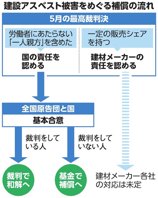一方、メーカー側の対応は鈍い。これまで被告となった約40社のうち10社の賠償責任が確定したが、和解の動きはなく、基金への拠出も定まっていない。基金法には、メーカーの補償を引き続き検討するとの条項がある。原告弁護団の山本一行団長は「国が和解して謝罪したという状況をもとに、企業にも和解を迫っていきたい」と話した。(阿部峻介)