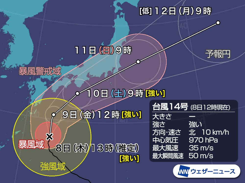 台風14号は10日(土)にかけてあまり速度を上げないまま四国沖へ北上する見通しです。その後、進路を北東に変えつつ紀伊半島沖から東海沖へ進み、10日(土)から11日(日)午前中にかけて東日本にかなり接近、または上陸するおそれがあります。 台風の中心が接近した場合、雨風ともに強まり荒れた天気となるため警戒が必要です。 ただ、上空の風が弱いことや、進路を司る高気圧の勢力の予想が難しいことなどから、台風が陸地に近づくか離れて通るかを正確に予想するのが難しい状況です。僅かな進路の差でも影響に大きな差がつきます。 明日9日(金)にかけての転向の状況次第で、その後の進路予報がより正確になる見通しですので、引き続き最新の予報を確認するようにしてください。