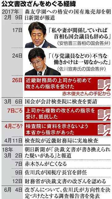 森友学園をめぐる財務省の公文書改ざんが発覚してから2年。自ら命を絶った近畿財務局職員の妻が、夫の自殺は改ざんを強制されたためだとして国と佐川宣寿(のぶひさ)・元同省理財局長を提訴した。改ざんは佐川氏の指示だとする手記や遺書も公開し、裁判での真相解明を求める。野党は改ざんの経緯などについて追及を強める構えだ。