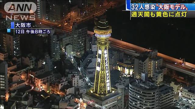 大阪府は12日、新たに32人の新型コロナウイルスへの感染を確認し、独自の基準「大阪モデル」に基づいて警戒を呼び掛ける黄色信号を点灯させました。 新たに感染が確認された32人のうち21人は感染経路が分かっていません。これにより、大阪府の独自基準「大阪モデル」で感染拡大の兆候を示す基準に達したとして、通天閣などを黄色に点灯させました。府によりますと、先月中旬以降の感染者のうち、キャバクラやホストクラブなど夜の街に関連した人が約3割で、30代以下の人が8割に上るということです。府は感染防止対策を取っていないこれらの店に行かないことなどを呼び掛けています。また、夜の街で働く人専用の検査場を設けるとしています。