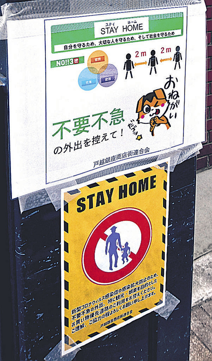 住宅地が近く、必要品の買い物などである程度の人出にはなってしまうが、商店街は約100枚の貼り紙や、DJのピストン西沢(55)の協力によるアナウンスで外出自粛を呼び掛けた。大型連休と重なった「ステイホーム週間」(4月25日~5月6日)は、自主休業に一体で取り組む商店街に都から奨励金が交付されることもあり、約7割の店舗が休業に賛同。戸越銀座商店街連合会の亀井哲郎専務理事は、約1か月前の人通りと比較し「ステイホーム週間で7割くらい減ったと思う。買い物も、時間帯をずらすなど工夫することに慣れてきている」と話した。