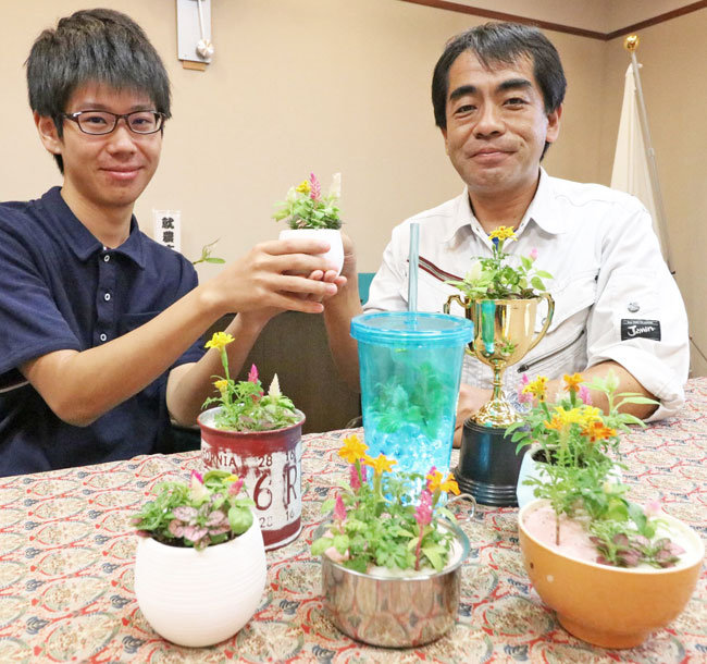 岐阜県立国際園芸アカデミーで花き生産を専攻する2年生の塚本祐也さん(20)は、夏の植物を使った手のひらサイズの「マイクロ寄せ植え」を完成させた。夏季は草丈が高くなりやすく、小さな寄せ植えを作るのは特に難しいが、矮化(わいか)剤処理などで極小化。5種類の花苗を直径6センチほどの小さな鉢に植えた。今後は秋・冬の植物での制作も計画している。