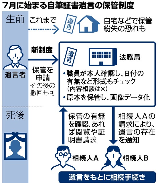 手書きの自筆証書遺言を法務局へ預けられる制度が7月に始まる。これまでは自宅などで自ら保管しなければならず、紛失や改ざんの恐れがあった。昨年は戦後最多の138万人が亡くなるなど相続が大量に起きる時代に入っており、遺言の使い勝手をよくして「争族」とも呼ばれる遺族間の紛争などを減らすねらい。