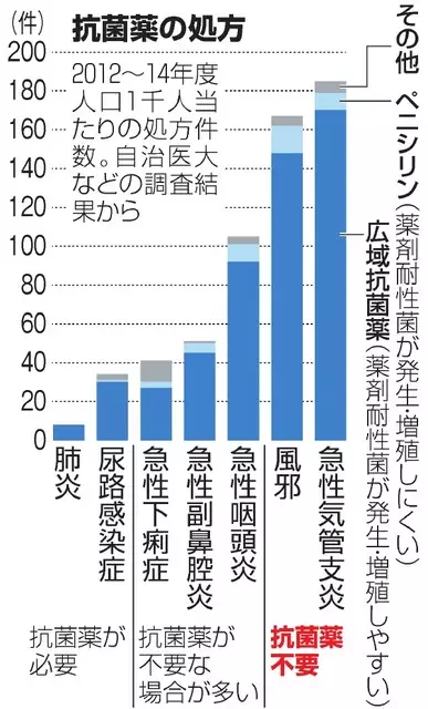 チームは全国の診療、処方明細書(レセプト)などのデータをもとに2012~14年度に外来診療で処方された抗菌薬と対象の病気などを調査。年平均約8957万件処方されていた。人口1千人あたり704件処方されており、米国の1・4倍だった。