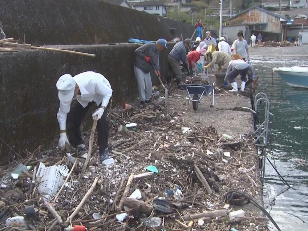 16日は午前7時半ごろから作業が行われ、地元の漁業関係者や住民らおよそ40人が、堤防に山積みになったゴミをスコップなどで一輪車に積み込み運び出しました。