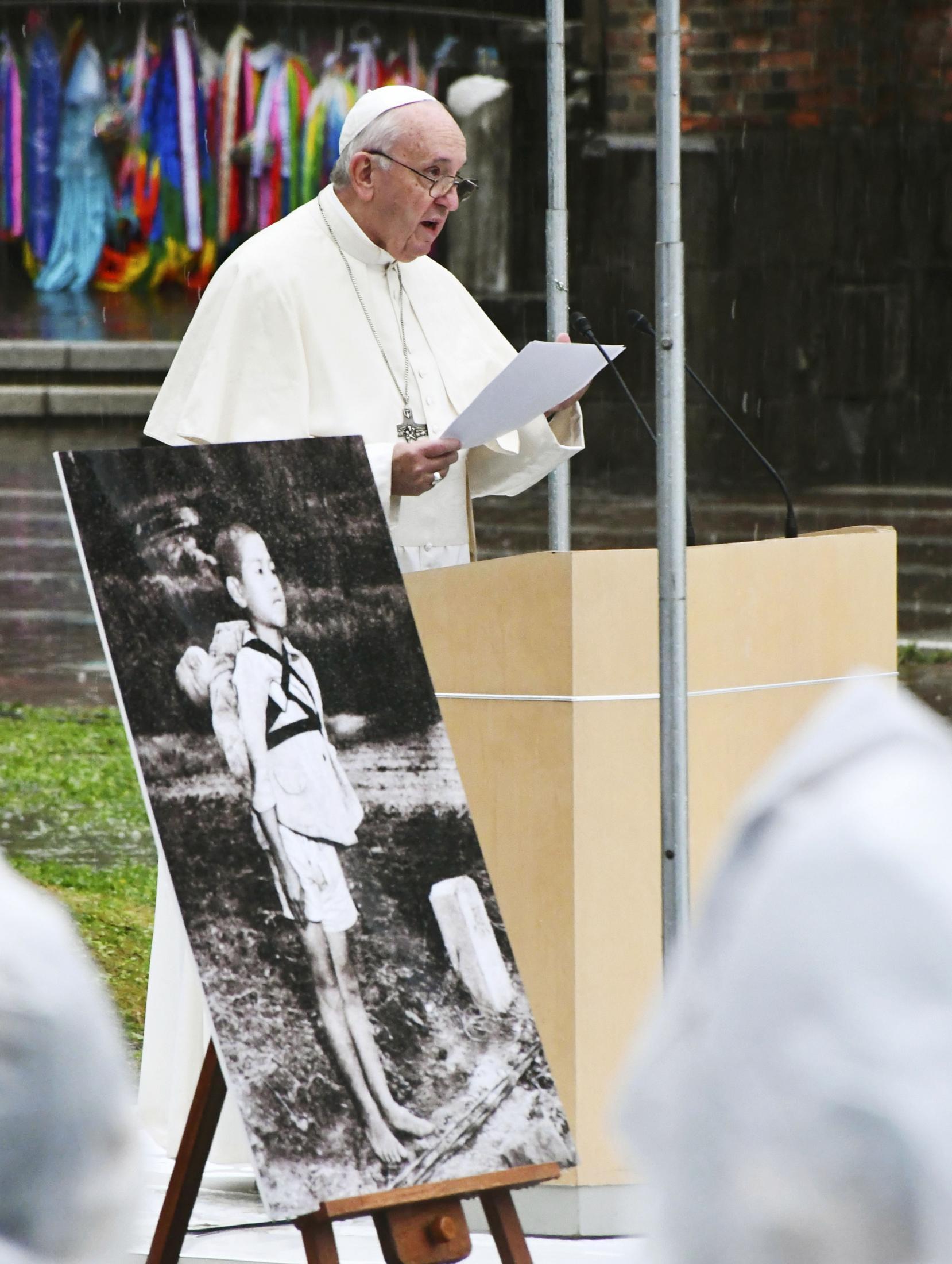 ローマ・カトリック教会の頂点に立つ教皇(法王)フランシスコは24日、被爆地の長崎と広島を相次いで訪問し演説、核廃絶を訴えた。長崎では「核兵器のない世界を実現することは可能であり必要不可欠だと確信している」と強調。広島では「真の平和は非武装の平和以外にあり得ない」として、核兵器を含む大量破壊兵器の保有や核抑止も否定、被爆地訪問は自らの義務だと感じていたと述べた。