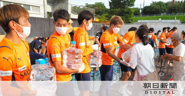 清水区のIAIスタジアム日本平では27日夕、サッカーJ1の清水エスパルスの選手約20人が被災者に飲料水を配った。配布時刻前から近くの道には車の列ができ、J1ジュビロ磐田から提供された500ミリリットルの飲料水7200本も用意された。