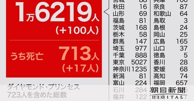新型コロナウイルスの国内感染者数は14日午後9時現在で、新たに100人確認され、累計で1万6219人となった。死者は17人増え、713人となった。
