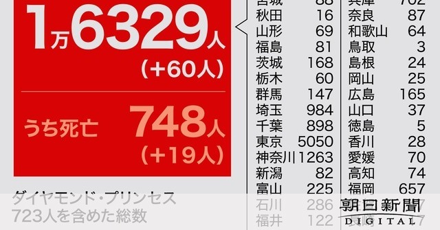 新型コロナウイルスの国内の感染者は16日午後9時現在で新たに60人確認され、1万6329人となった。死者は19人増え、748人となった。