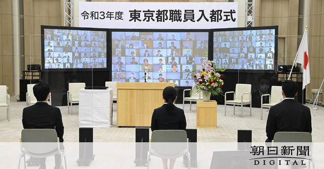 1日に東京都庁のホールで開かれた入都式には、新入職員約1700人の代表として4人が参加した。例年は東京芸術劇場(豊島区)に全員を集めて開いてきたが、昨年に続いて取りやめに。代表以外の新入職員は、オンラインで式の様子を視聴した。