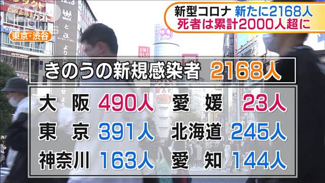 22日、国内で新型コロナウイルスの感染が新たに確認されたのは2168人でした。死亡した人は7人で、累計で2000人を超えました。 国内の新規感染者2168人のうち、大阪の490人と愛媛の23人はこれまでで最多です。国内の感染者2000人以上は5日連続です。死者は北海道で3人など合わせて7人でした。国内の死者はクルーズ船などを含め、22日までの累計は2001人と2000人を超えました。