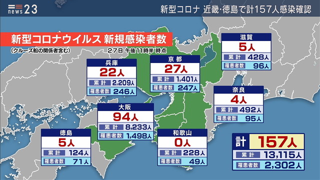大阪府で8月27日新たに感染が確認されたのは検査数2070件のうち94人で、陽性率は4.5パーセントでした。また、80代の女性と70代の男性2人の死亡が確認されました。一方、8月27日、現在での重症者数は8月26日から10人減って58人となり、2週間ぶりに60人を下回りました。 兵庫県では新たに22人の感染と90代の女性の死亡が確認されました。女性はクラスター(感染者集団)が発生していたグループホームの利用者で、この施設での死者は2人目です。 このほか京都府で27人、滋賀県と徳島県で5人、奈良県で4人と、8月27日に近畿と徳島ではあわせて157人の感染が新たに確認されました。