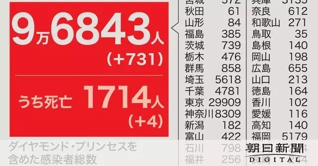 新型コロナウイルスの国内感染者は24日午後9時までに、新たに731人が確認された。4人が死亡した。東京都では203人の感染がわかった。1日あたりの感染者が200人を超えるのは1週間ぶり。