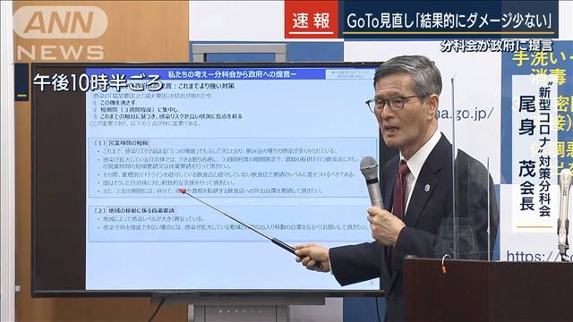 政府の新型コロナウイルス対策分科会の尾身会長は、感染が拡大している札幌について、個人の見解として、「『ステージ3』に入っているのではないか」との認識を示しました。GoToトラベルキャンペーンの見直しを提言したことについては、「感染の早期鎮静化につながり結果的には、経済的なダメージも少なくなる」と説明しました。また、「感染の可能性を自覚しながら検査を受けない事例も増えている」と指摘し、改めて、症状が出れば早期に受診するよう呼び掛けました。
