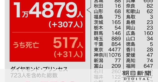 国内で新型コロナウイルスに感染し亡くなった人は、2日午後10時現在で新たに11都道府県の計31人が確認され、517人に達した。1日の死者数としてはこれまでで最多。東京都では中野江古田病院(中野区)の11人を含む15人、北海道と大阪府でも3人ずつが亡くなった。新たな感染者は全国で307人が確認され、累計で1万4879人になった。