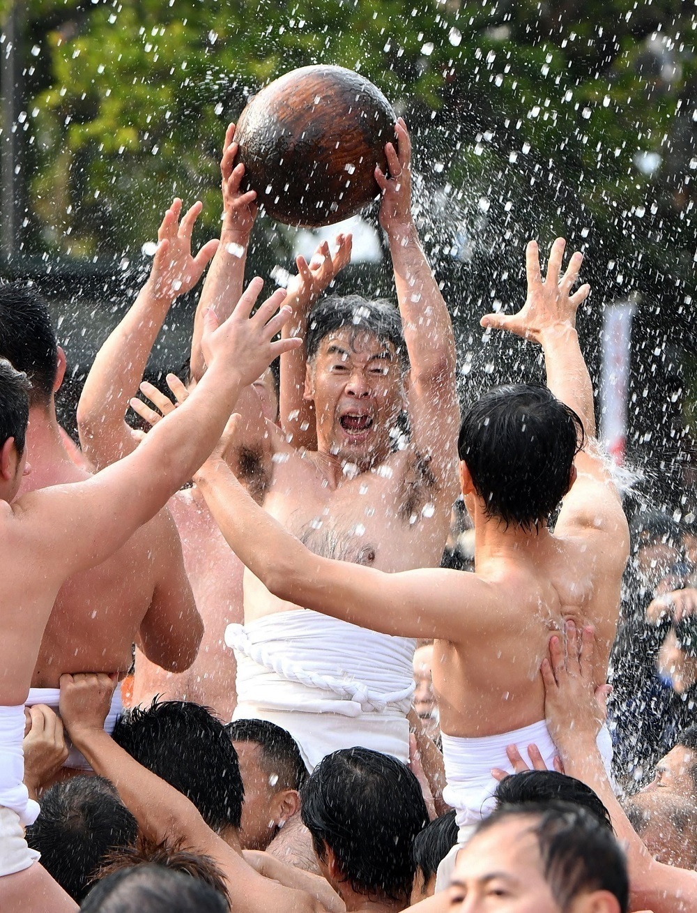 約300人の競り子は「陸(おか)組」「浜組」に分かれ、「オイサ、オイサ」の掛け声とともに、陽玉を激しく奪い合った。境内に陽玉が到着すると、競り子たちは「祝いめでた」を歌い、参拝客から大きな拍手が起きた。 (今井知可子)