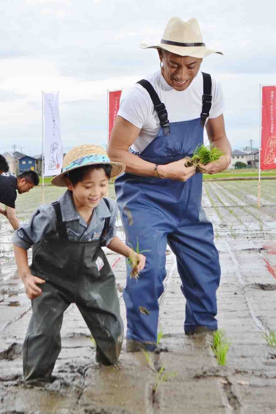 歌舞伎俳優の市川海老蔵さん(41)と長男の勸玄(かんげん)君(6)は9日、新潟市で米「新之助」の田植えを行った。勸玄君が2020年5月に「8代目市川新之助」を襲名するため、「同じ名前のブランド米を持つ新潟県として、ご縁を感じていた」(花角英世県知事)ことから、県が田植えイベントに招いた。歌舞伎界と農業、“双方の新之助”の成長を願って苗を植えた。