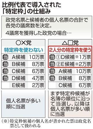 参院選の比例代表は、有権者が政党か候補者の名前を書いて投票する。これまでは政党の得票に応じて配分される議席の中で、候補者が個人名の票数を競う「非拘束名簿式」だった。