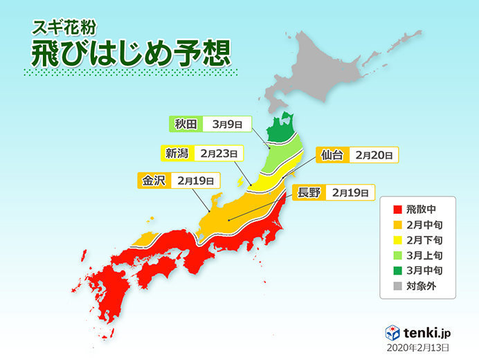 まだ飛散開始を確認していない地域でも、東日本を中心に2月中には飛散開始となるところが多いでしょう。3月上旬には東北北部でも飛散開始となる見通しです。