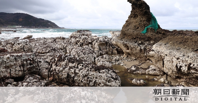 岩は同市馬緤(まつなぎ)町の沖約100メートルにあり、地震前は2メートルほどが水面から出て、干潮時でも岩の周辺は海水につかっていた。岩に近づいてみると、かつては海中にあった岩の部分は白っぽくなり、乾燥した海藻がへばりついて、小さなサザエなどが転がっているのが確認できた。