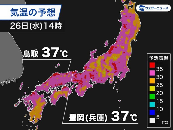 37℃:甲府、豊岡(兵庫)、鳥取、益田(島根)