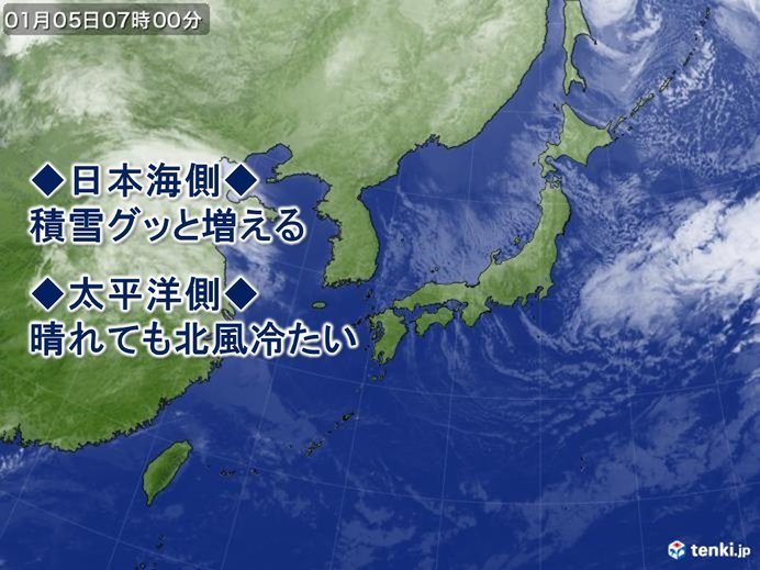 きょう5日の午前中は日本海側を中心に雪が降り、積雪がグッと増える所があるでしょう。ただ、午後は次第に雪は収まる見込みです。太平洋側は大体晴れますが、北風が強まり、冷たい風が身にしみる一日に。