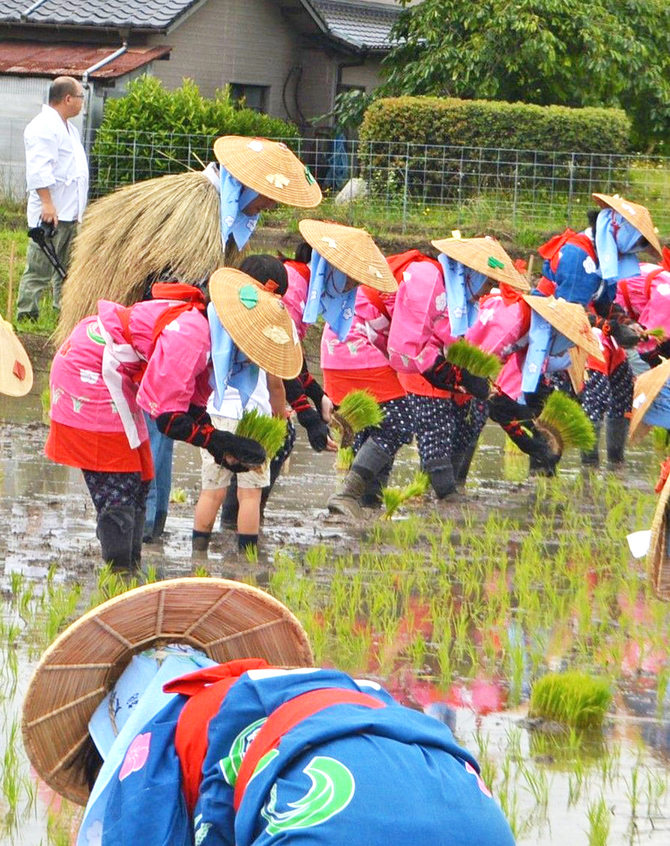 福岡県太宰府市観世音寺の太宰府天満宮斎田で16日、初夏の神事「御田植祭(おたうえさい)」があった。神職や氏子、地元の農業関係者ら約300人が秋の豊作を祈った後、菅笠(すげがさ)にもんぺの早乙女姿の女性たちが田に稲の苗を植えた。15日に予定されていたが、悪天候の予報だったため、この日の神事となった。