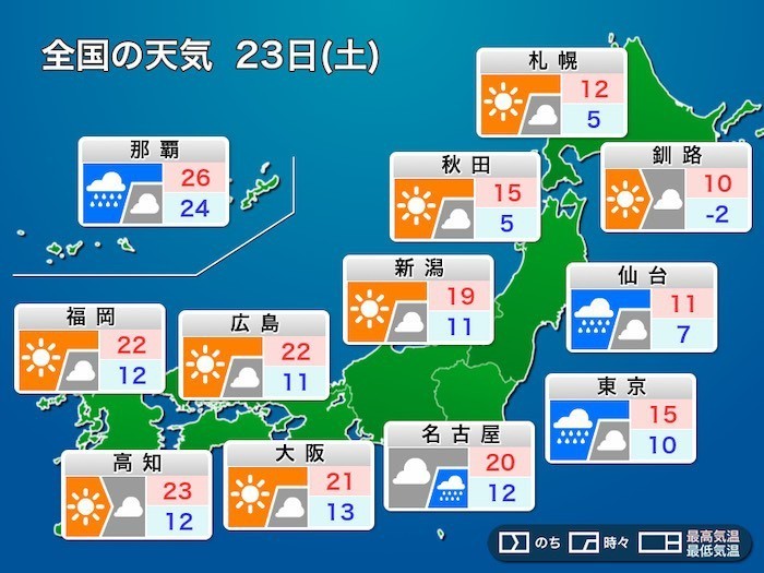 明日23日(土)は、移動性の高気圧に覆われ、広い範囲で日差しが届きます。