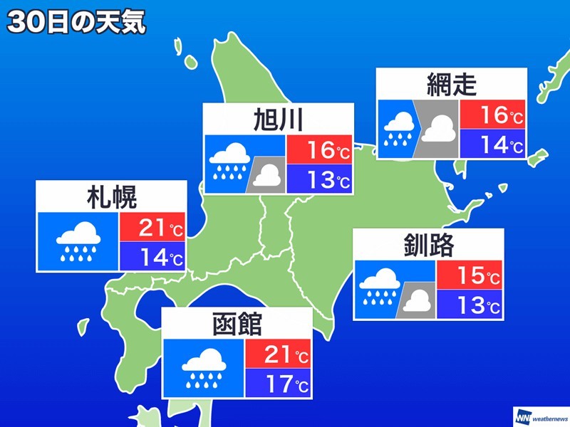 北海道では、秋雨前線の通過で明日30日(日)にかけて広範囲で雨の降りやすい天気が続きます。明日は道央や道南エリアで局地的な大雨に警戒が必要です。 前線が徐々に南下したあとは、上空の寒気が流れ込みます。気温は右肩下がりとなり、昼間は一気に秋がきたような肌寒さとなる予想です。体感の急激な変化に注意してください。