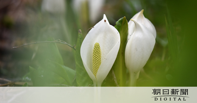 ミズバショウはサトイモ科の多年草。白い花びらのように見えるのは「仏炎苞(ぶつえんほう)」という葉が変化したもので、中にある黄色い部分が花の集まりだ。散策路から木々の間をのぞくと、雪解け後にモノトーンだった湿地が、仏炎苞の明るい白で生き生きと輝いていた。